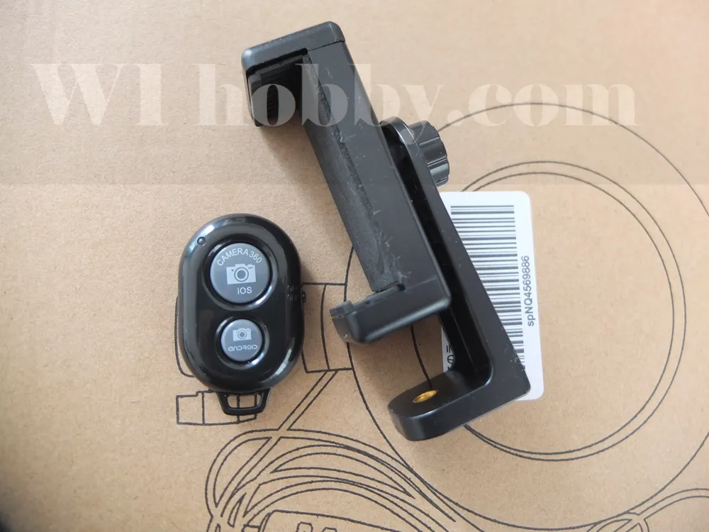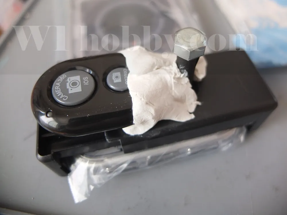 この中にスマホホルダーとリモコンシャッターがありました。このホルダーにリモコンごと粘土で固めたらどうだ?